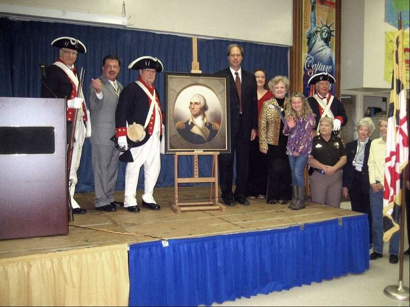 The Ella Virginia Houck Holloway chapter of the United States Daughters of 1812, under the auspice of the Thomas Stone chapter of the Sons of the American Revolution, presented a copy of Rembrandt Peale’s portrait of George Washington to Principal Gregory R. Miller and Vice Principal Caroline Timmons of T. C. Martin Elementary School in Bryantown on Oct. 16, 2012.. Members of the U.S. Daughters of 1812, Holloway chapter included chapter President Carol Whitsell and her granddaughter, Lilly Wolff, a student at Martin and a member of the Children of the American Revolution; Recording and Corresponding Secretary Anne Boone, wife of SAR member Charles Boone; Registrar Joyce Candland; chapter Treasurer, Historian and Photographer Dena Cruz; chapter Chaplain