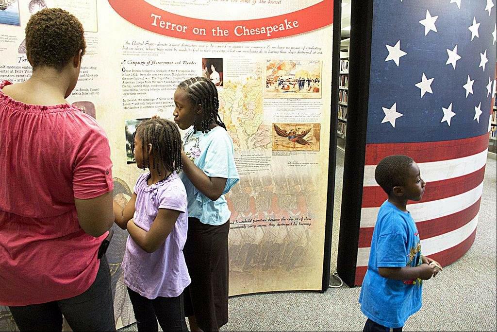 Staff photo by TIN NGUYEN Kerranne Byrd-Taft explains to her home-schooled children, from left, Jayme, Theldra and James, features of the traveling exhibit of the War of 1812 on display at the P.D. Brown Memorial Library in Waldorf. The display highlights various stages of the war in Maryland, including the British naval offensives starting at Benedict and leading up to the District of Columbia, and the siege of Fort McHenry that gave rise to “The Star Spangled Banner.”